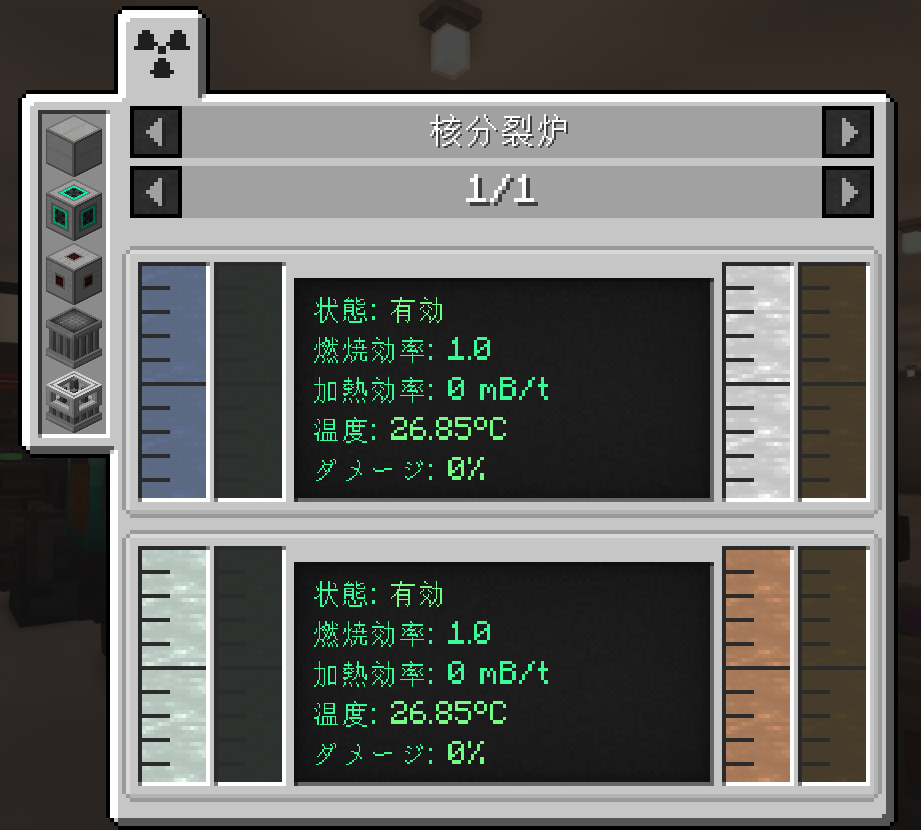 2023-03-06 Mekanism 核分裂炉で発電② 燃料の生産 Minecraft Mekanism 前回:↓ damepo9696.hatenablog.com 今回は核分裂炉を動かすための燃料について解説 核分裂炉シリーズ記事 ①発電のプロセスの説明 ②燃料の生産 ③核分裂炉の作成 ④工業用タービンの構築 必要な燃料と冷媒 核分裂燃料の生産 図解 必要な燃料と冷媒 前回説明した通り、核分裂炉を動かすには核分裂燃料と冷媒が必要になる 冷媒に関しては電動ポンプ等で水を供給してやるだけでいいけれど、核分裂燃料は結構面倒な工程を経て生産する必要がある ※冷媒にナトリウムを使う方法もあるが水を使う方が楽だしおすすめ ※効率を求めるならナトリウムもあり 核分裂燃料の生産 図解 必要な素材と加工装置をまとめたので参照あれ できあがった燃料は化学タンクにでも溜めておこう この時点ではただの燃料なので放射漏れについては特に心配しなくてよい